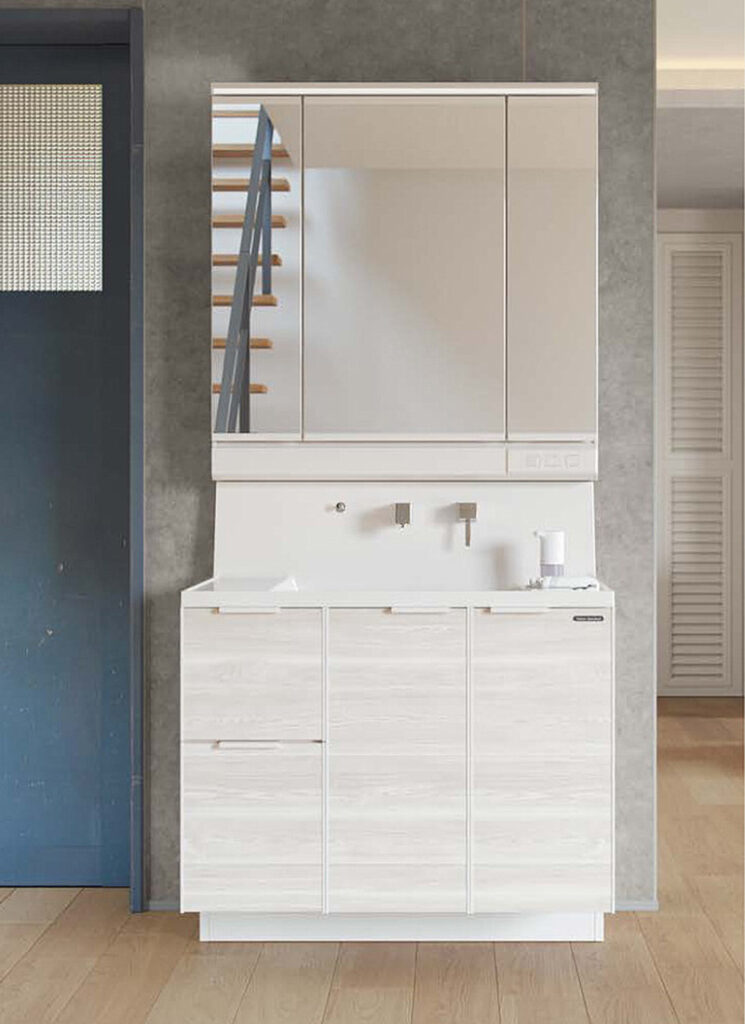 木目調やタイル調、シンプルモダンなど、インテリアに合わせて選べるデザインが豊富です。生活感を隠せる「隠す収納」設計で、いつでもスッキリおしゃれな印象に✨朝の身支度時間も、気分が上がりますよ!